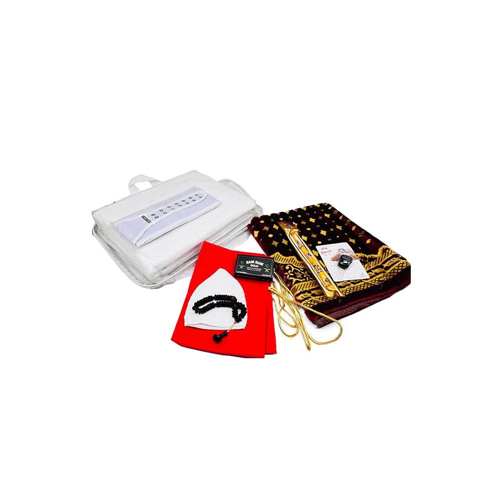 • Complete Pilgrim Kit for Hajj & Umrah: Includes Ahram (1300g), Belt, Prayer Mat, Cap, Tasbih, Miswak, Counter, and Non-Fragrance Soap – all essentials in one pack.