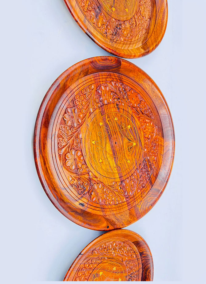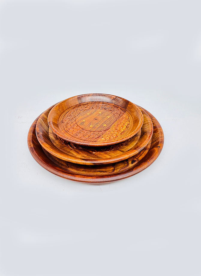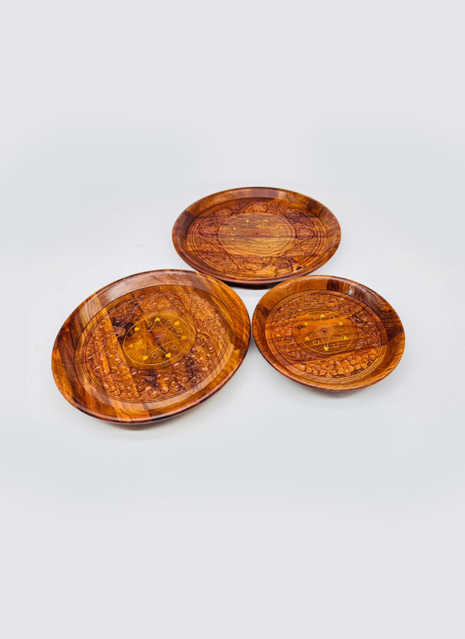 Upgrade your dining presentation with this Handmade Shesham Wood Plate Set, crafted from premium natural Sheesham wood known for its strength and rich natural grain. The set includes three serving plates in sizes 12″, 10″, and 8″, perfect for serving meals, snacks, fruits, or desserts. Designed with traditional craftsmanship and a smooth polished finish, these wooden plates combine durability, elegance, and functionality for everyday dining or special occasions.