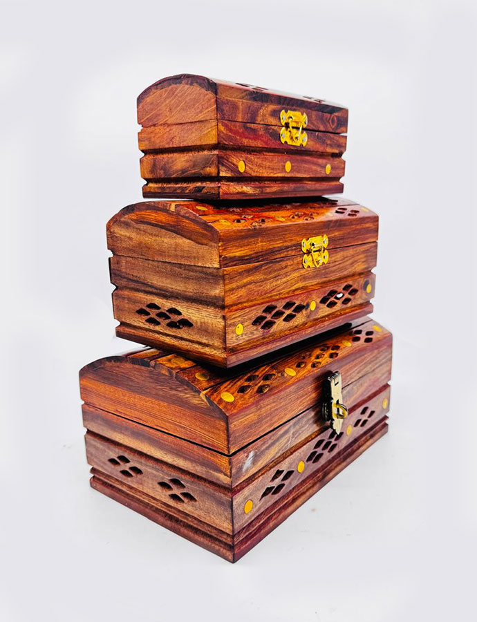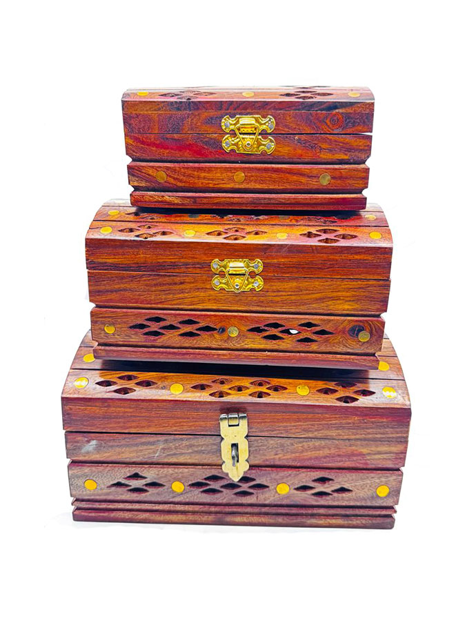 This elegant Handmade Wooden Jewellery Box set includes 3 beautifully crafted storage boxes in sizes Small (4×6 inch), Medium (5×8 inch), and Large (7×10 inch). Designed with fine craftsmanship and a polished wooden finish, these multipurpose boxes are perfect for storing jewelry, keepsakes, watches, or precious items. Their timeless design makes them ideal for home décor, personal use, gifting, or retail display, combining functionality with classic beauty.