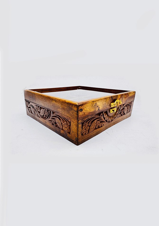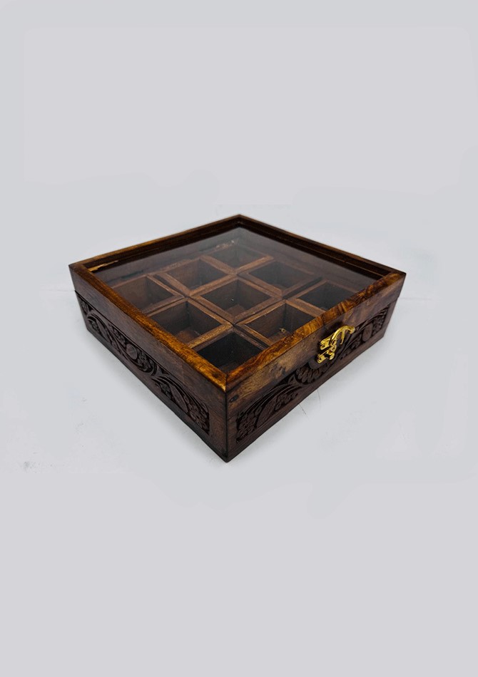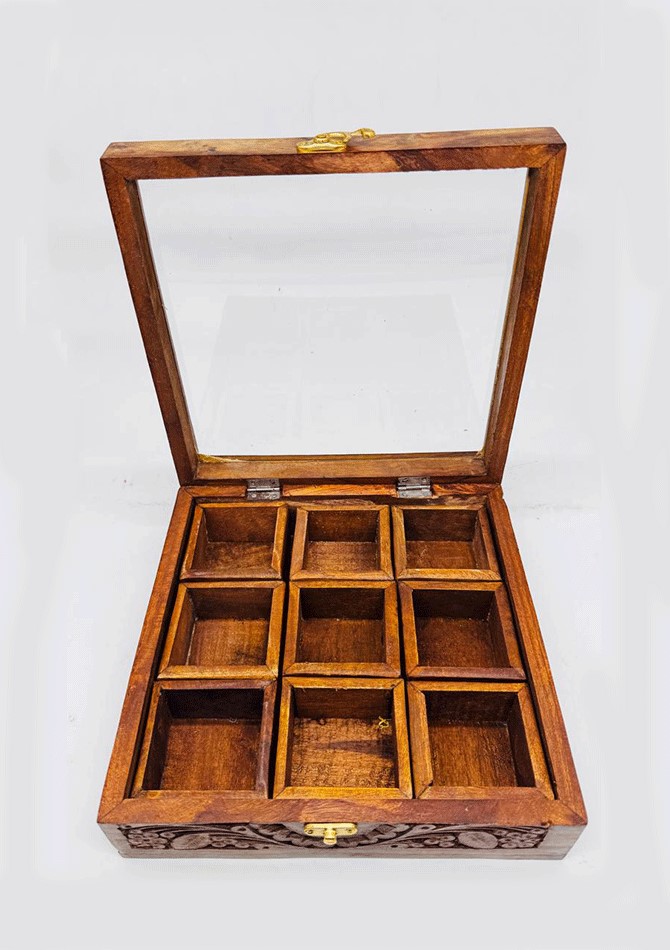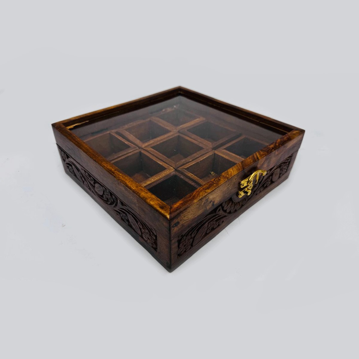 Organize your kitchen in traditional style with this handmade wooden spice box (Masala Box) featuring a clear glass lid for convenient viewing. Crafted with durable natural wood, this 12-inch spice container is perfect for storing everyday spices, herbs, and seasonings while keeping them fresh and easily accessible.